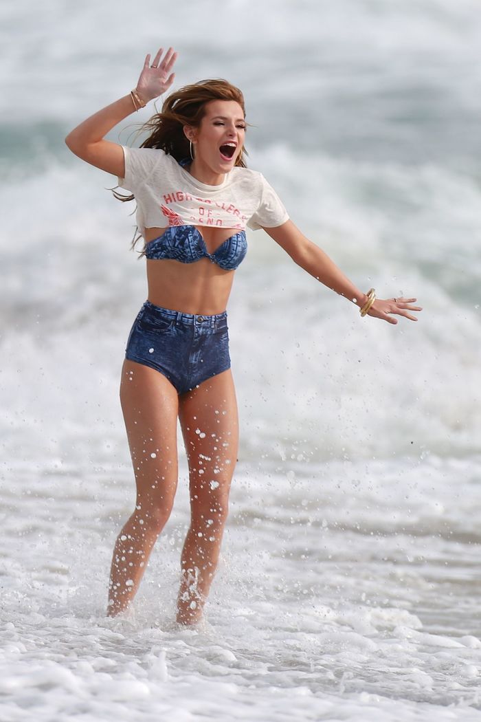 Bikinis Bella Thorne splashes in the surf as she showcases her knockout body in bra and hotpants on photo shoot Bella Throne took great delight showcasing the results as she took part in a racy photo shoot in a bra and hotpants in Malibu. ShareSharePin It