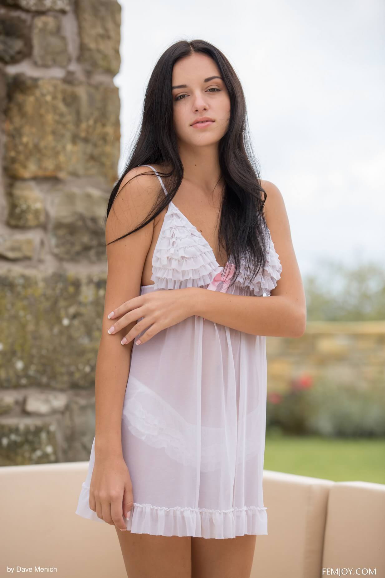 Sasha dances slowly outside of her house, enjoying the cold breeze. Her mesh lingeries floats over her skin softly, rippling with the air. She gently tugs at it, peeling it off and smiles coyly before lying down on the couch behind her. Sasha runs her fingers along her long black hair, enjoying the beautiful day and excited to keep spending it outside.
