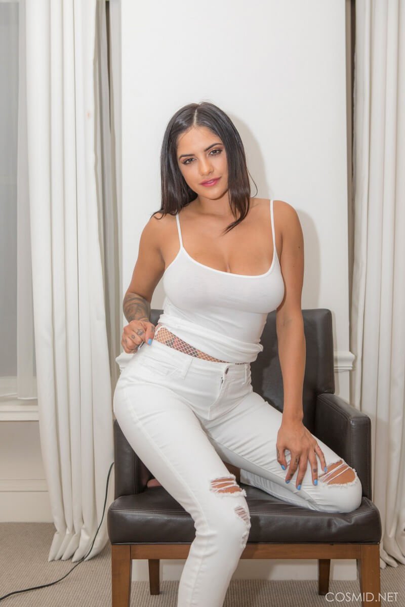 Her tattooed ass is tempting but her big natural tits are exceptional. Enjoy the attractive brunette girl removing her white t-shirt and jeans.