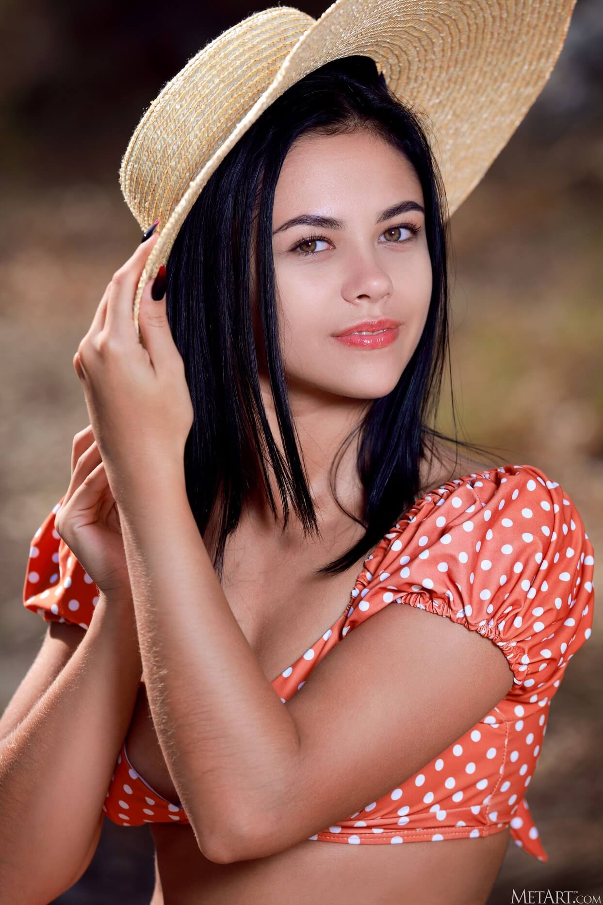 Fresh erotic gallery with perfect pin-up beauty Dzhili removing her glamorous bikini and straw hat.