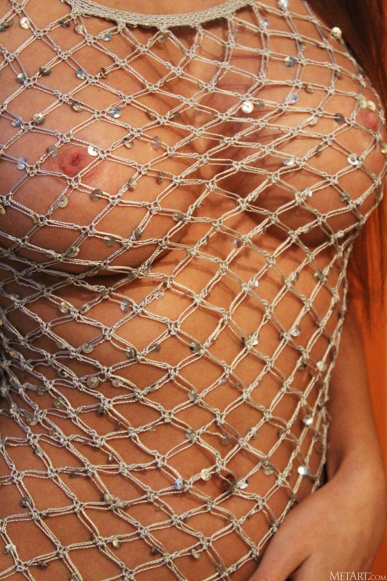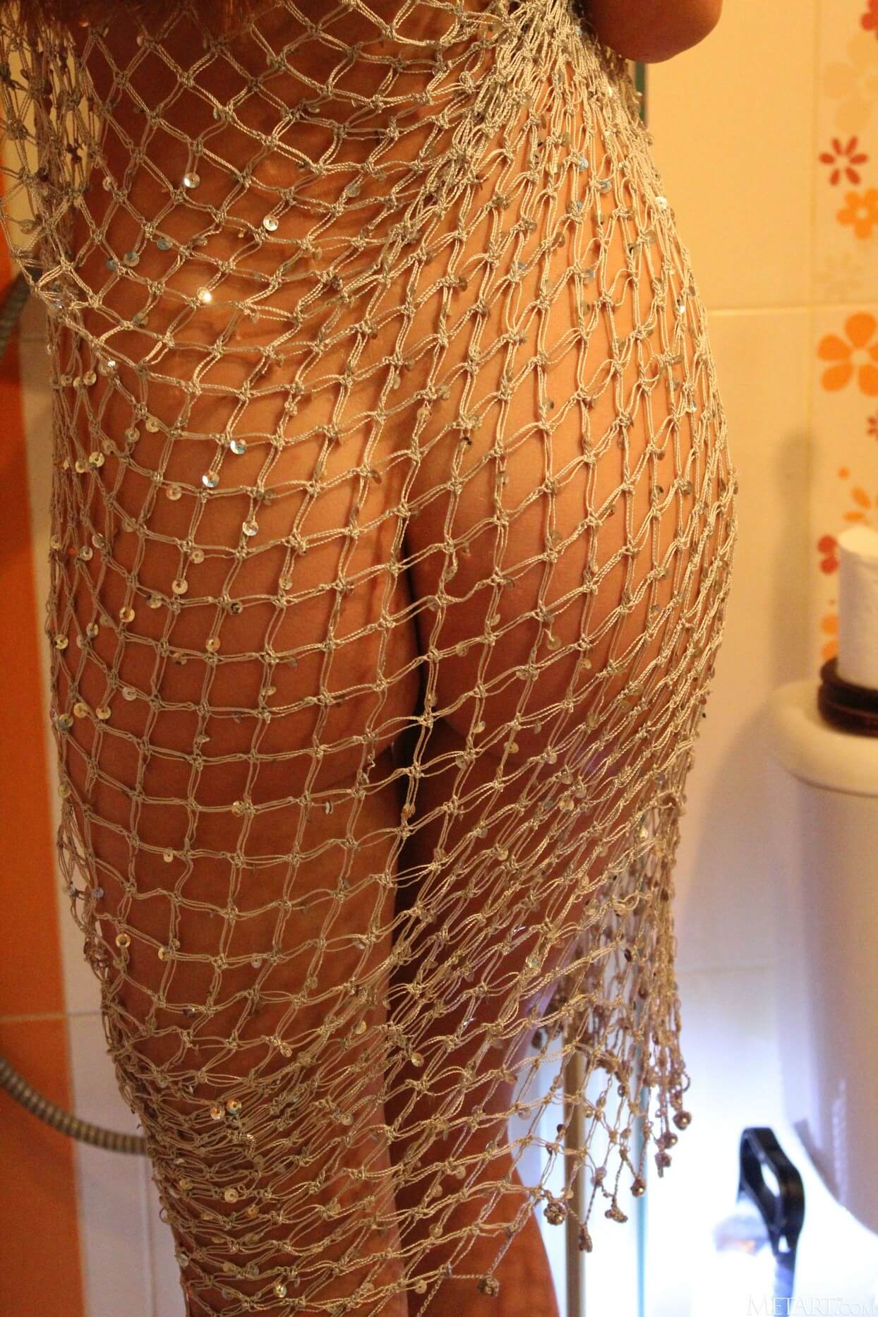 The sexy green-eyed seductress lets water cascade over her gorgeous body, her nipples poking through the mesh enticingly. She caresses her big beautiful breasts as she gets naked, her shaved pussy and curvaceous ass glistening wetly, her smile a sultry invitation.