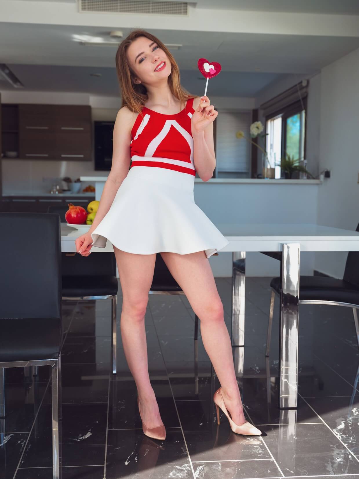 Cute Elvera sucks on a candy heart as she flips up her skirt to flash her red lace panties. Lifting her top, she smiles naughtily and fondles her gorgeous breasts. It’s not long before the perky babe is naked, stroking and spreading her shaved pussy. She bends over the kitchen counter to ride her fingers harder, grinding her candy against her sticky slit as she masturbates to a sweetly satisfying orgasm.
