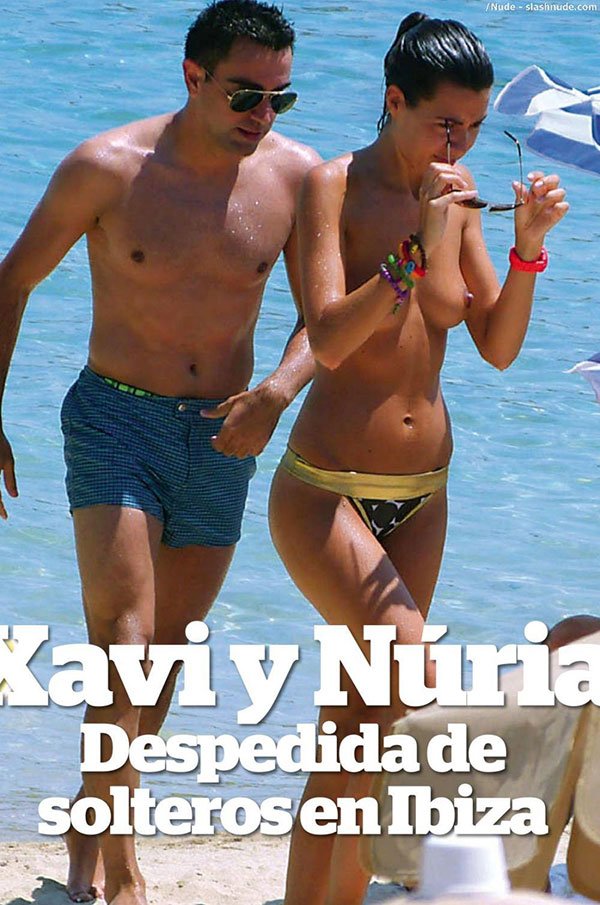 FC Barcelona captain Xavi Hernandez and her wife Nuria Cunillera together on the beach from summer vacation. topless nipple poking