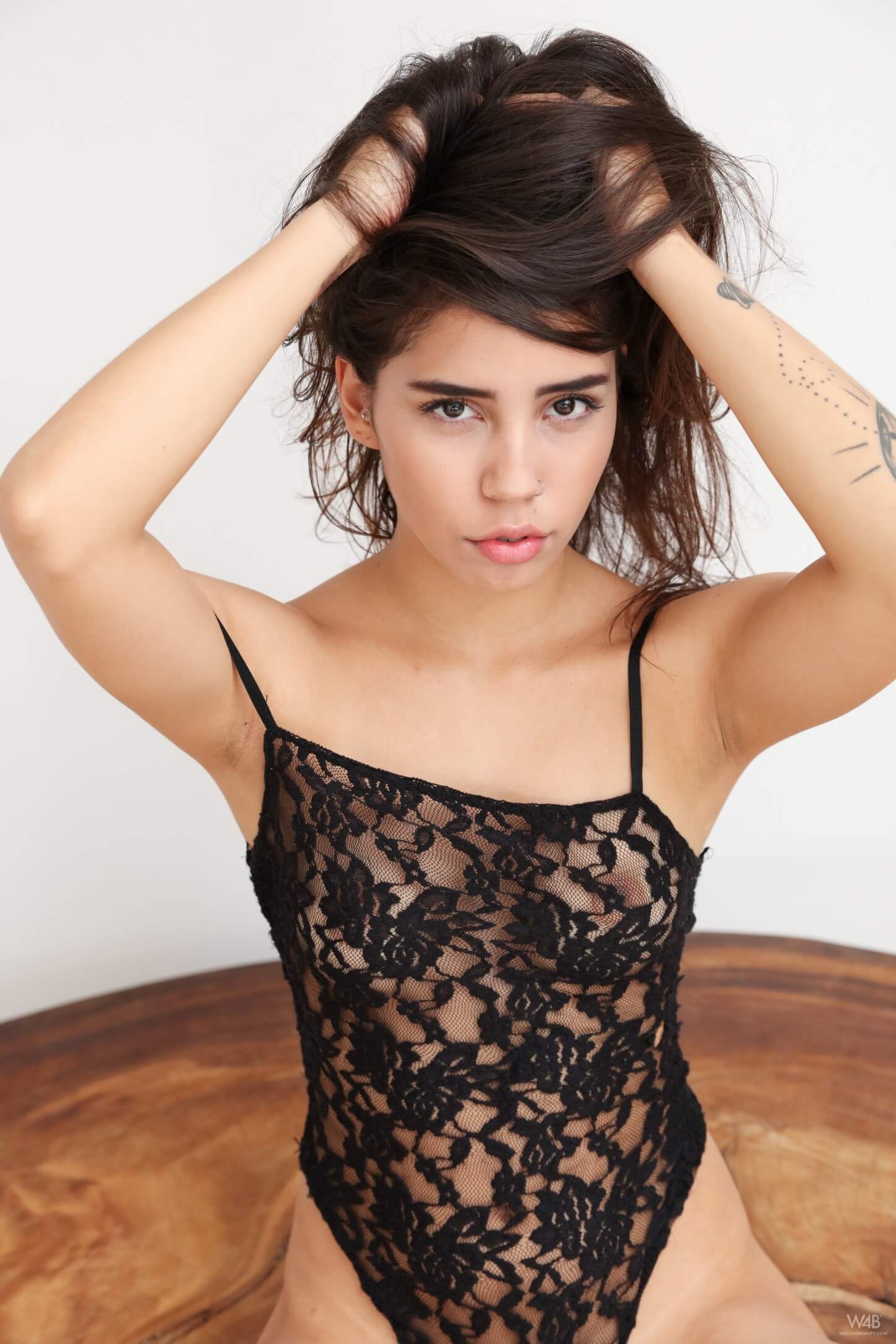 Busty Tattooed Babe Gets Fully Undressed at Home (gif)